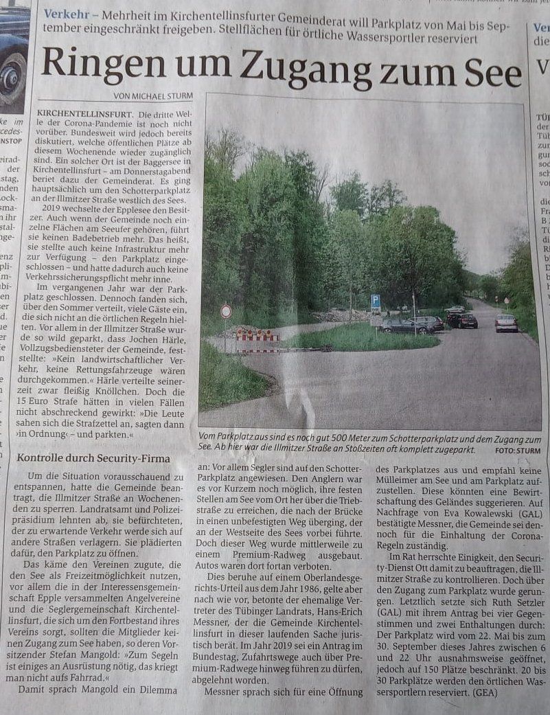 Ab dem 20.06.2022 ist der Parkplatz am Epple-See, Zufahrt über die Illmitzer Straße, möglich. Vorläufig ist die Zufahrt über eine mit einem Zahlenschloss versehene Kette gesichert. Bitte legt eine Kopie Eurer Erlaubniskarte/Parkkarte gut sichtbar in Euer Fahrzeug. Nur so kann man unbefugte Fahrzeuge/Parker sofort erkennen....